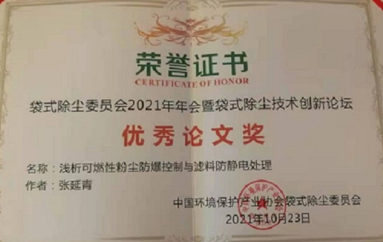 同時,論文“淺析可燃性粉塵防爆控制與濾料防靜電處理”喜獲優(yōu)秀論文獎。